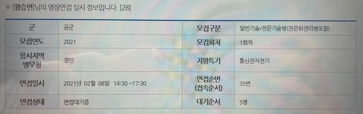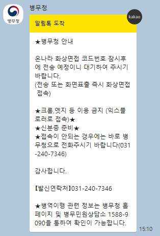오늘 오후 3시에 공군 면접을 봤다. 원래는 경인병무청에 가서 면접관과 대면해 면접을 봐야 했겠지만, 병무청은 작년부터 코로나19 때문에 모든 모집병 면접에 대해 화상 면접을 실시한다.